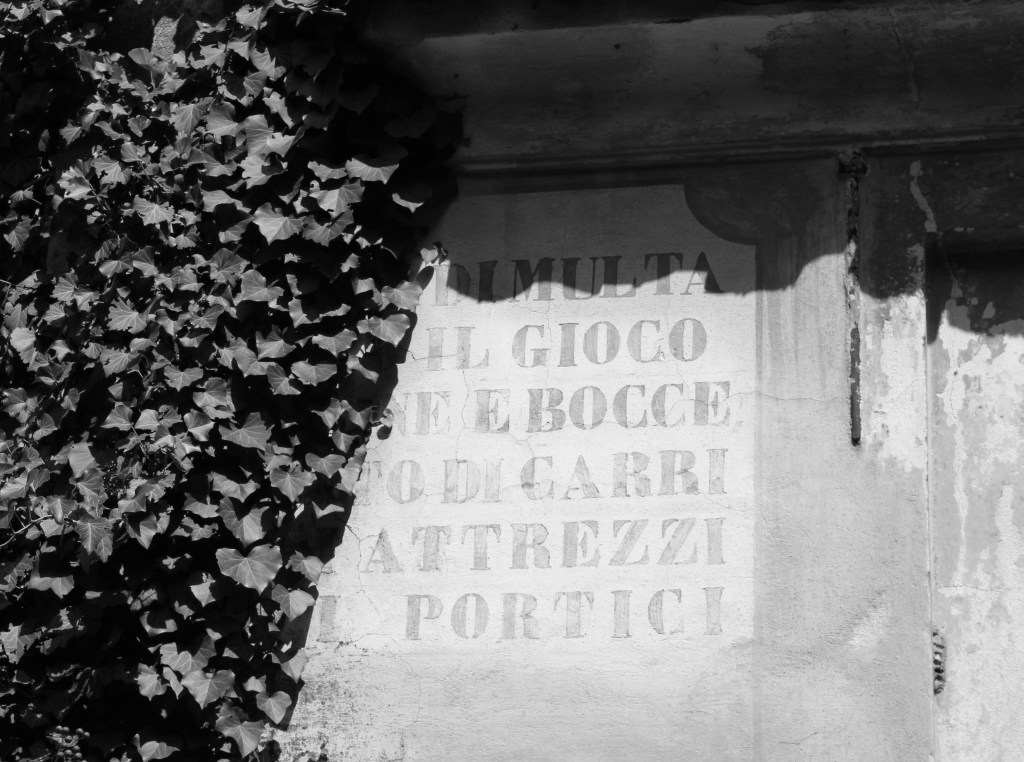 Vi si troverebbe secondo diverse fonti disponibili sul web il dipinto della Madonna in Mandorla più bello del monregalese, ma nelle mie fotografie non lo vedrete. O non l’ho cercato nel posto giusto o è talmente compromesso da non essere riconoscibile, mi auguro più la prima che la seconda ipotesi. Sarebbe bello augurarsi che l’affresco sia stato staccato da chi di competenza e sia tutt’ora conservato in un luogo più adatto, ma non abbiamo informazioni disponibili. Sotto il porticato, quasi mangiate dalla vegetazione, fanno ancora capolino alcune interessanti scritte come quella qui sotto.