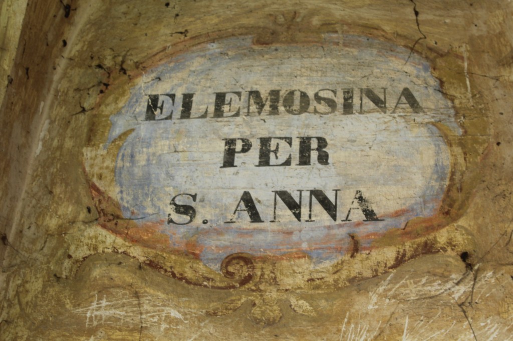 …e subito sembra di sentire il rumore delle ruote dei carri sul selciato, gli schiamazzi acuti dei bambini e le grida più roche dei vecchi che giocano a bocce. Un attimo ed è tutto passato, ma per un istante una finestra temporale si è aperta ed il porticato è tornato com’era: pieno di suoni, centro del paese, crocevia di chiacchiere e di storie. Altre iscrizioni ci parlano della vita sacra e della devozione popolare, soprattutto del culto per Sant’Anna, madre di Maria.
